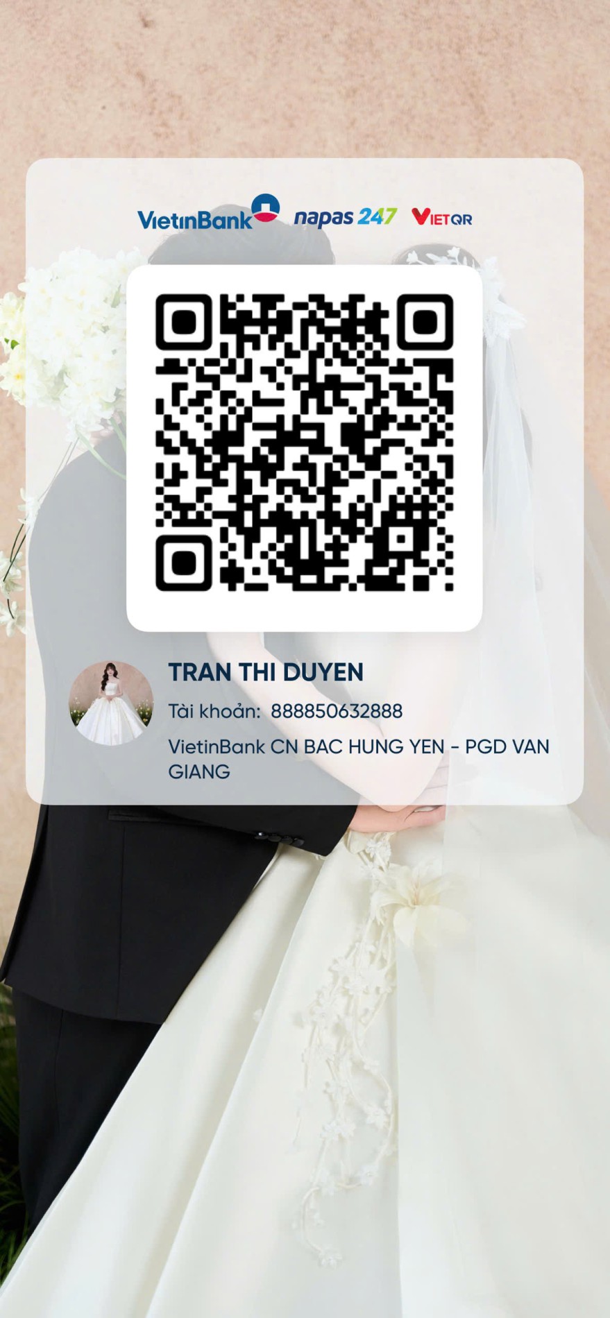 Cô dâu thuộc tuýp người hướng nội . Sở thích nấu nướng và đi du lịch cùng gia đình.